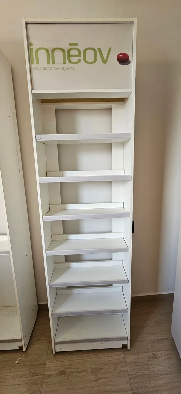 Móveis para farmácia, sendo 7 expositores vertical com prateleiras e luz; 1 expositor vertical com painel canaletado e luz; 4 balcões caixa com painel canaletado na frente; 3 expositores de chão com gôndola, prateleiras e divisórias transparentes na parte superior; 3 módulos organizadores verticais com painel canaletado; 1 balcão expositor com vidro nas laterais; 1 balcão expositor com acrilico; 1 expositor de preço; 3 módulos pequenos expositor de encartelados; 1 expositor de balcão; 1 totem de álcool gel; vários ganchos para painel canaletado