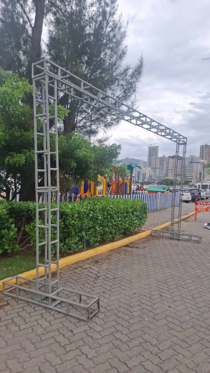 Pórtico de treliça resistente, ideal para eventos e feiras. Estrutura metálica que garante segurança e praticidade na montagem. Perfeito para banners, iluminação e decoração.