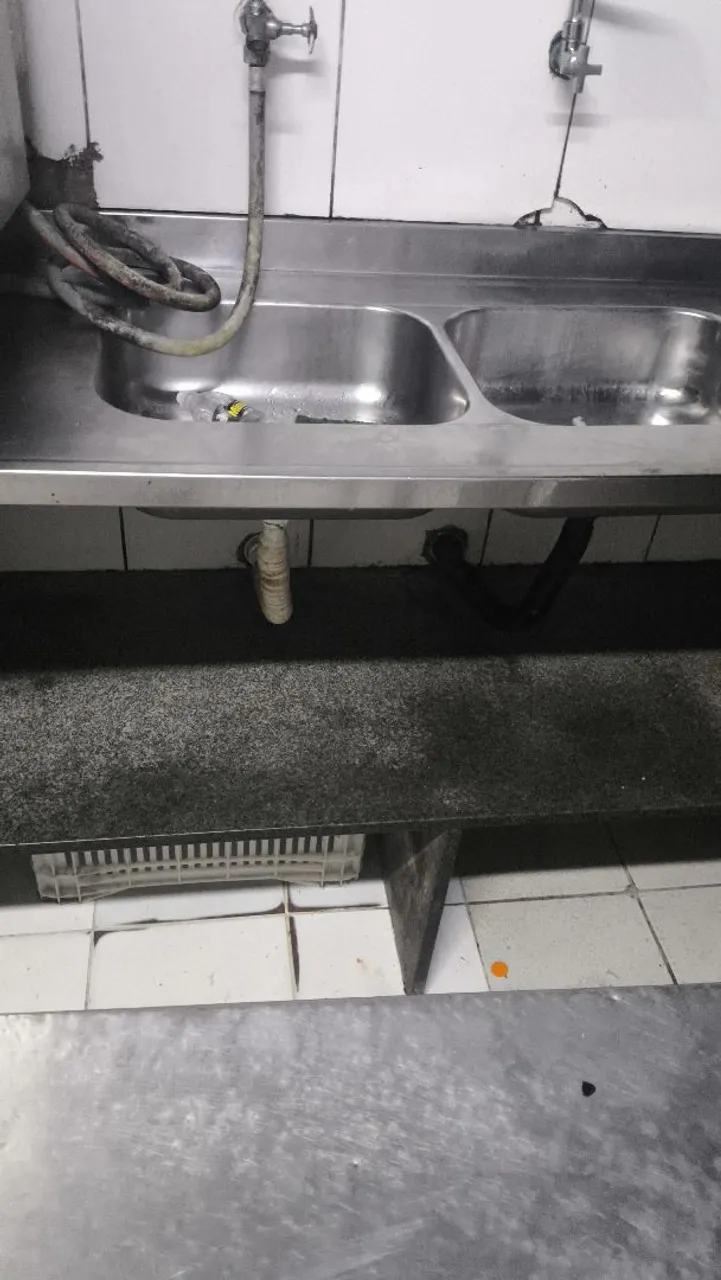 Pia industrial de duas cubas, perfeita para otimizar o espaço e a eficiência na sua cozinha. Ideal para restaurantes, lanchonetes e outros estabelecimentos gastronômicos.
