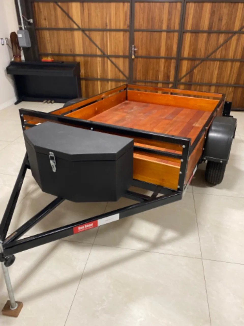 Carretinha de madeira com design exclusivo. Tem espaço interno livre 2.10x1.45m, tem amortecedor e molejo, baú, cabe facilmente um kart dentro. Comprada nova em 2025, com pneus novos, não tem nem 1 ano de uso, usada no máximo 3 vezes.