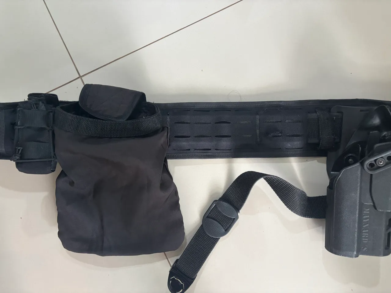 Cinto tático modular com diversos acessórios, ideal para operações e atividades que exigem praticidade e segurança.