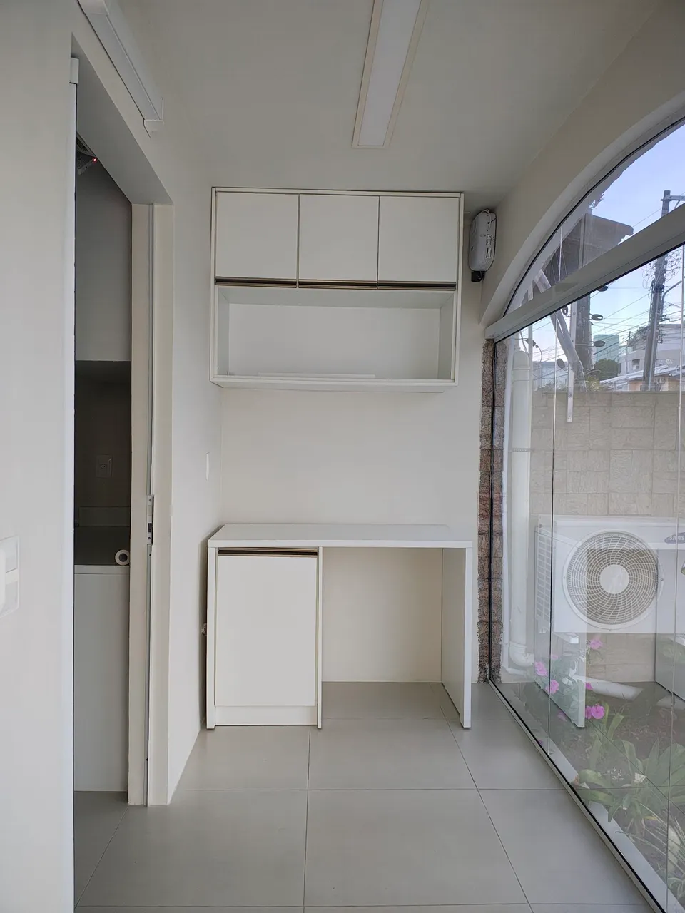 Sala já mobiliada com 20m² com banheiro adaptado, piso porcelanato, armários, e ar-condicionado. Ideal para profissionais da beleza, estética ou área da saúde.