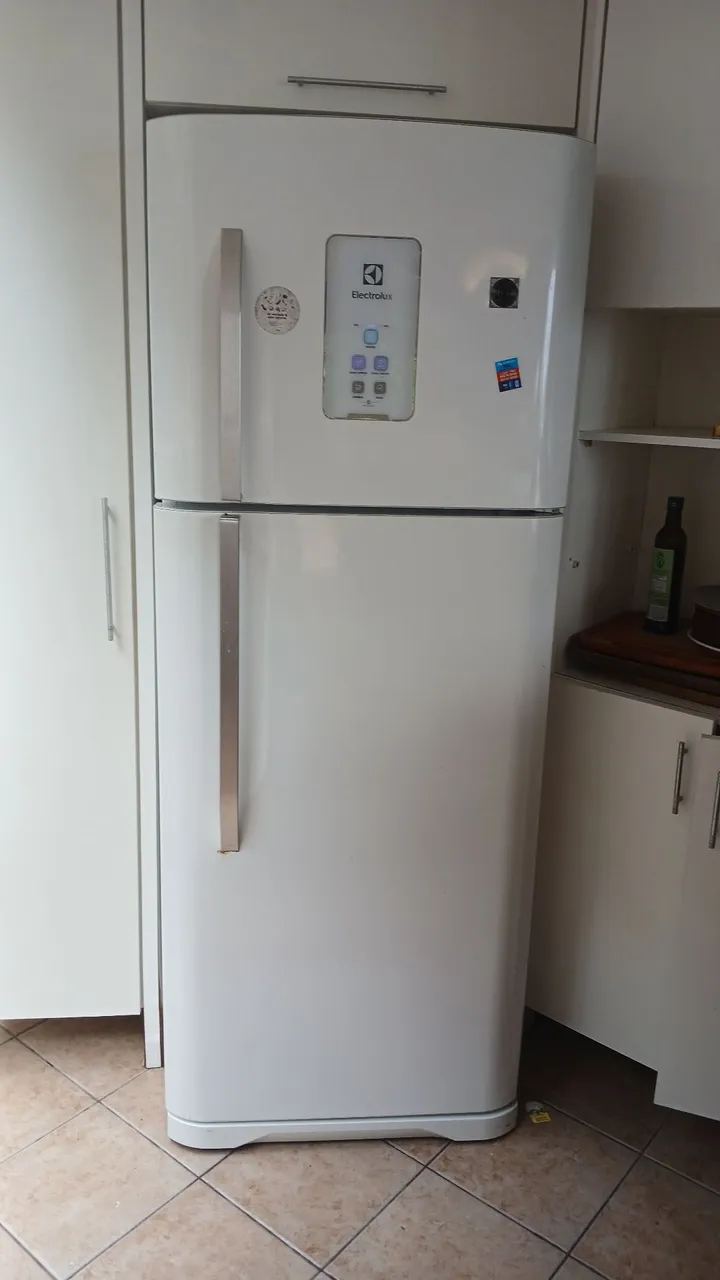 Geladeira duplex frost free da marca Electrolux. Possui configurações de modo turbo para o freezer, suporte para gelo e outros.