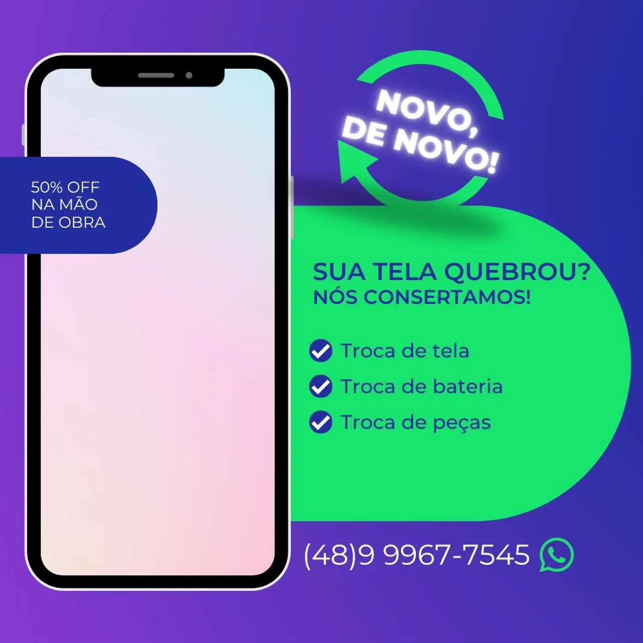 Seu celular com tela danificada tem solução! Realizamos a troca de tela, bateria e peças, deixando seu aparelho como novo. Conte com nossa expertise e 50% de desconto na mão de obra. Entre em contato!