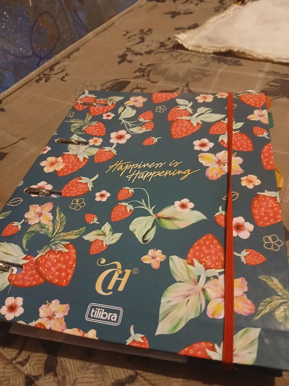 Lindo fichário da tilibra com estampa de morangos e flores. Usei durante um mês ano passado. Em boas condições, com um pequeno rasgo na capa, com divisórias dentro e pasta transparente para folhas