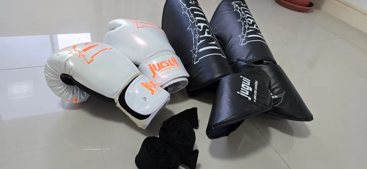 Está em perfeito estado, usei duas vezes a luva e a caneleira não foi usada.