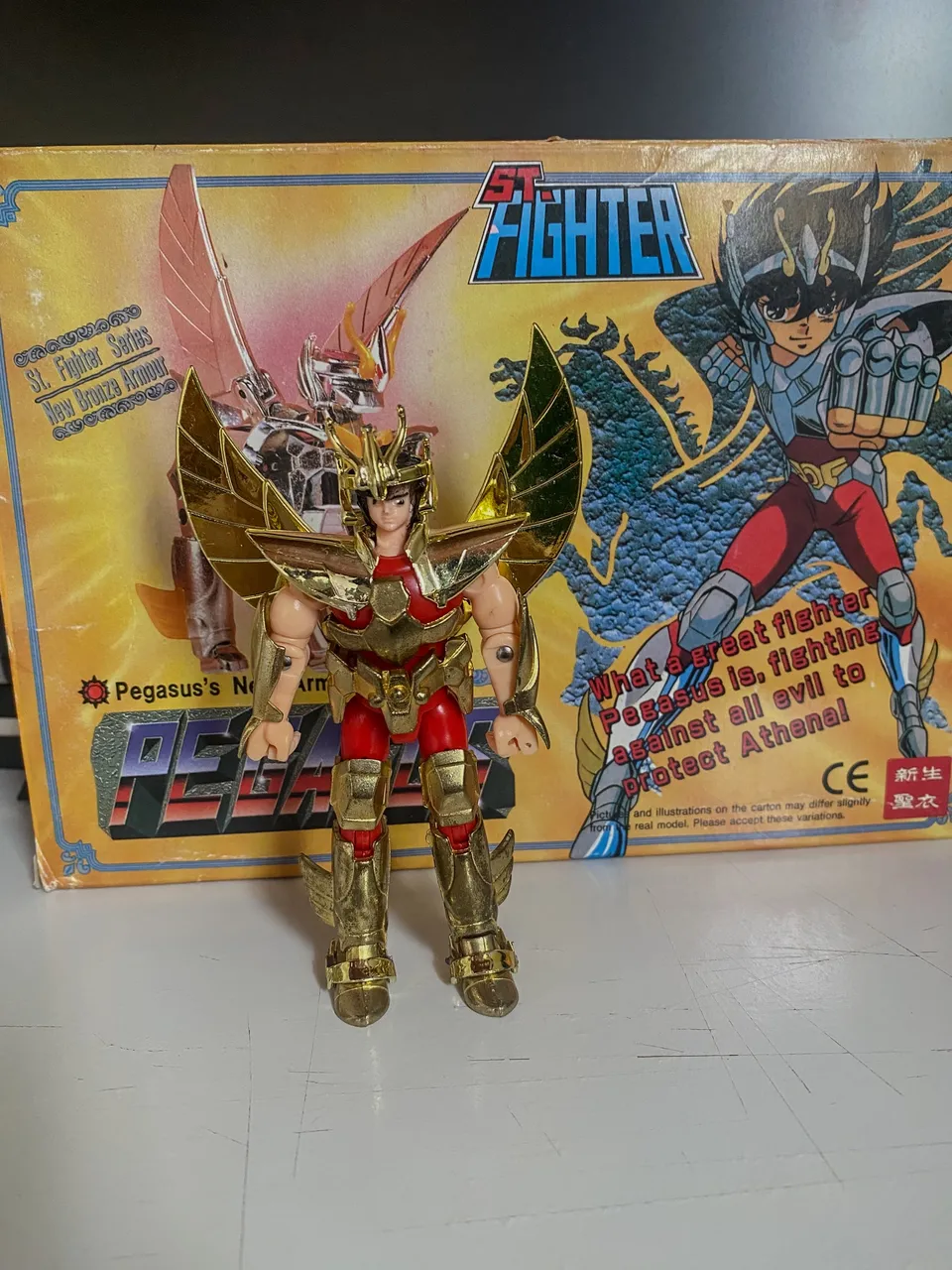 Seya v2 da versão dourada da marca Saint Fighter. O boneco está rígido, sem oxidação, a caixa, isopor , blister, Armadura e peças plásticas em ótimo estado. Acompanha a cópia do manual.