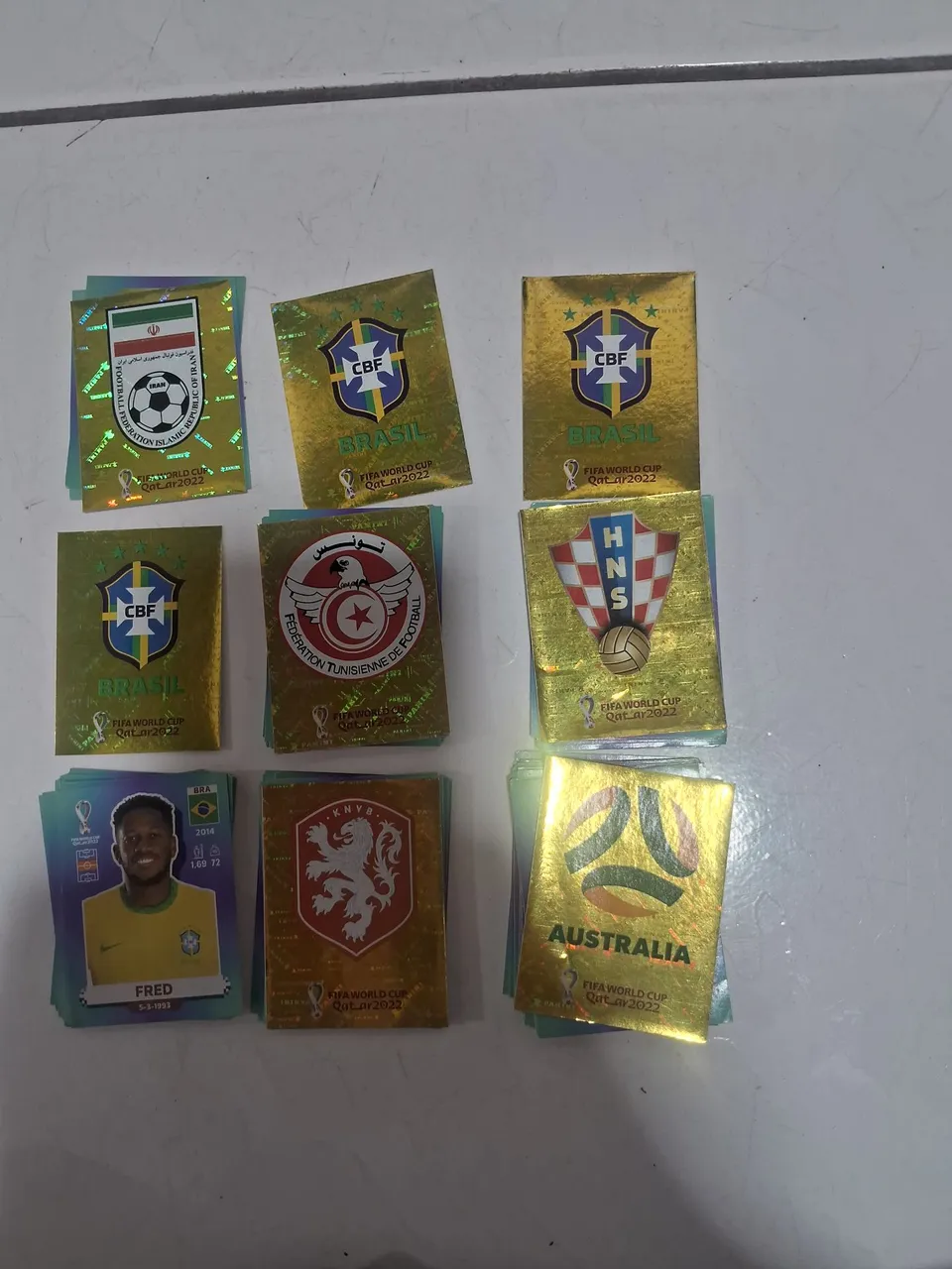 Vendo figurinhas especiais da Copa do Mundo (douradas), incluindo símbolos/escudos das seleções e jogadores da coleção Panini Copa do Mundo.