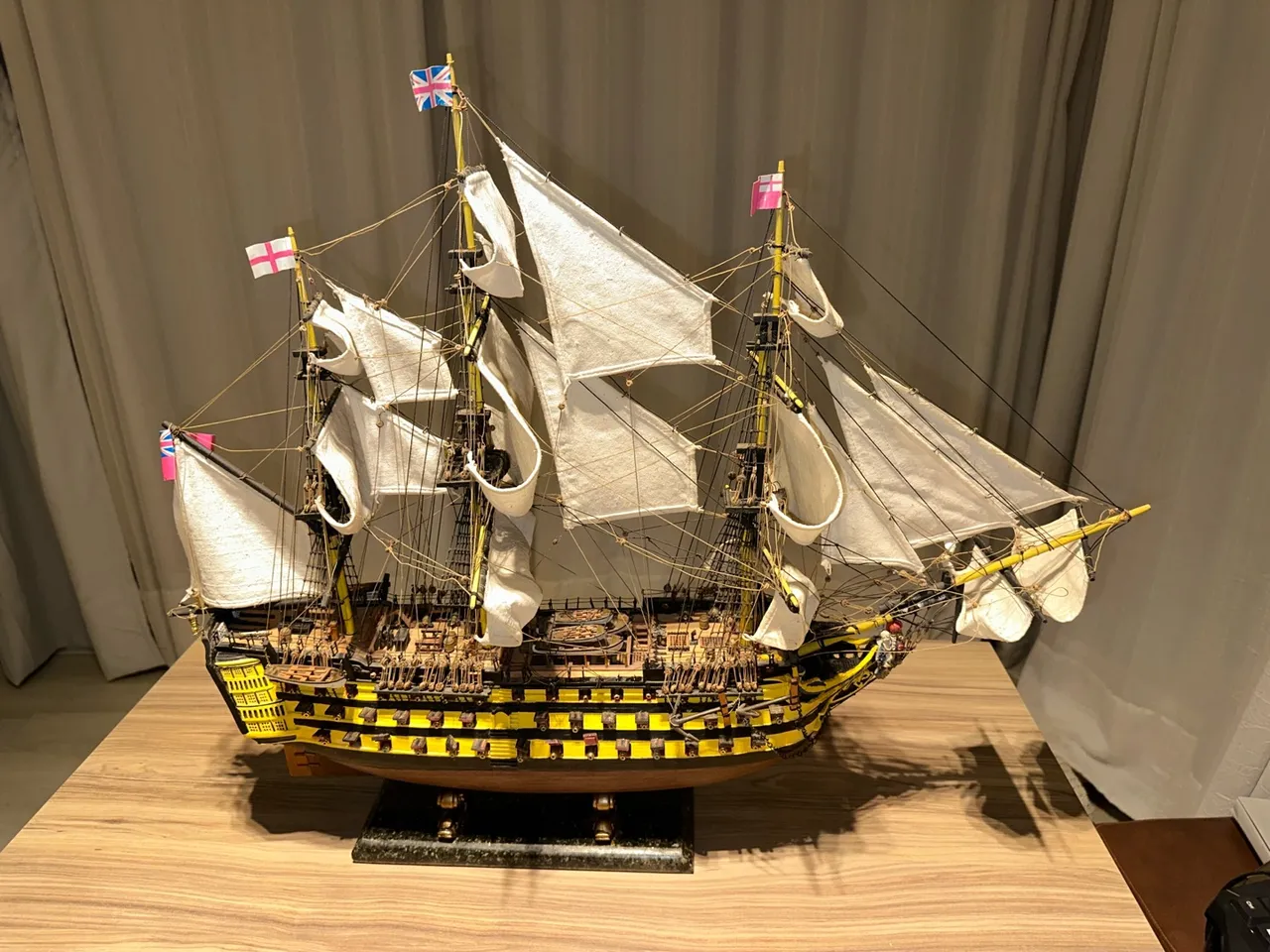 Navio modelo HMS Victory, feito em madeira, metal e tecido (não há peças em plástico), com detalhes impecáveis. Não é brinquedo, mas sim item decorativo. Perfeito para colecionadores ou amantes de história naval.