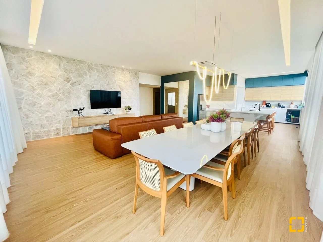 Sala de estar e janta com cozinha integrada em excelente disposição tornando o ambiente extremamente funcional, com grandes aberturas do chão ao teto que proporcionam uma sensação de aconchego e uma vista deslumbrante