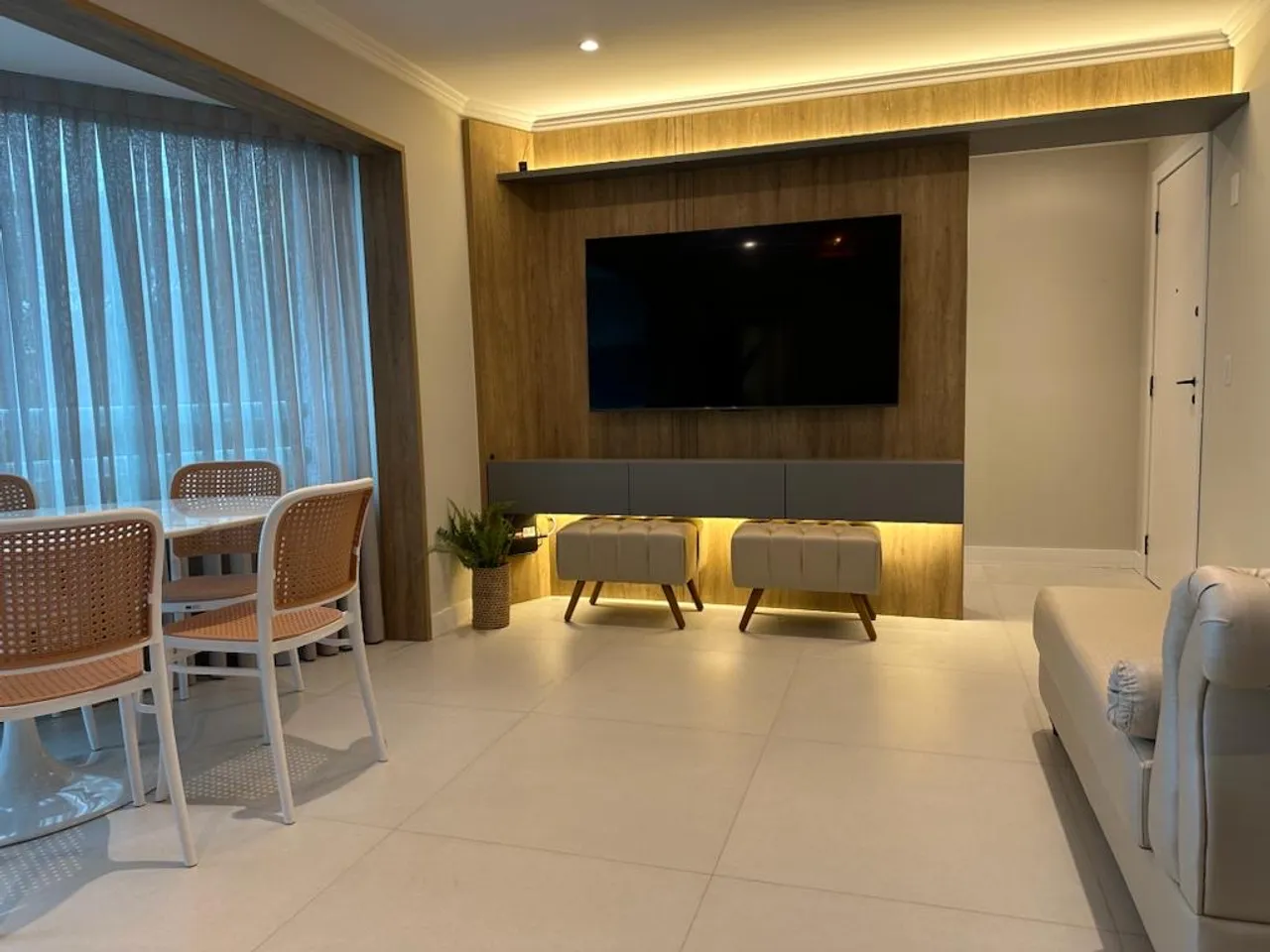 - A sala possui uma TV de 65 polegadas, sofá cama e churrasqueira.