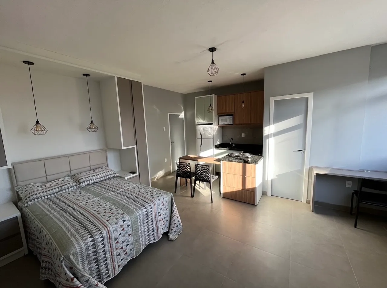cama box, split, tv, móveis planejados no dormitório, cozinha c geladeira, microondas, fogão, utensílios, pratos, panelas
