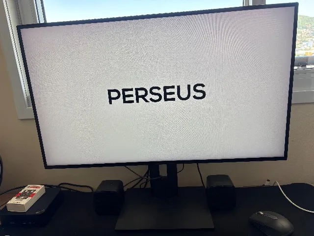 Monitor Pichau Perseu V1 27 polegadas QHD (2K) 60-75Hz, Free Sync, IPS LCD. Possui DisplayPort USB-C, HDMI, Saída de Audio, Auto falante embutido. O USB-C passa vídeo e alimenta até 60W. Sem detalhes, funcionando normalmente.