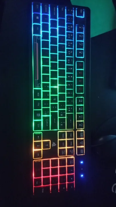 Teclado de membrana praticamente novo usado por pouco tempo, nao possui nenhum desgaste, possui Led colorida e todas suas teclas funcionam, quando conectar no notebook ou pc precisa clicar na tecla "scroll lock" pra poder ligar a luzinha, quando desliga o notebook/pc ele fica aceso enfeitando o ambiente, e para desligar tem que desconectar ele.