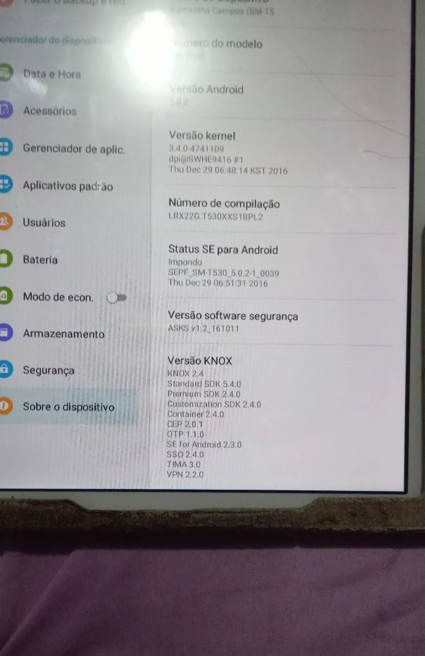 Tablet samsung (tab 4 SM-T530), tamanho grande, cor branco, Android 5.0.1, tela em perfeitas condições e com película, não tem toque fantasma, capinha da Minnie inclusa. (A única avaria é que tem vezes que ele reinicia sozinho). Pode me mandar uma mensagem se quiser mais informações (exemplo: ver um vídeo do tablet funcionando).