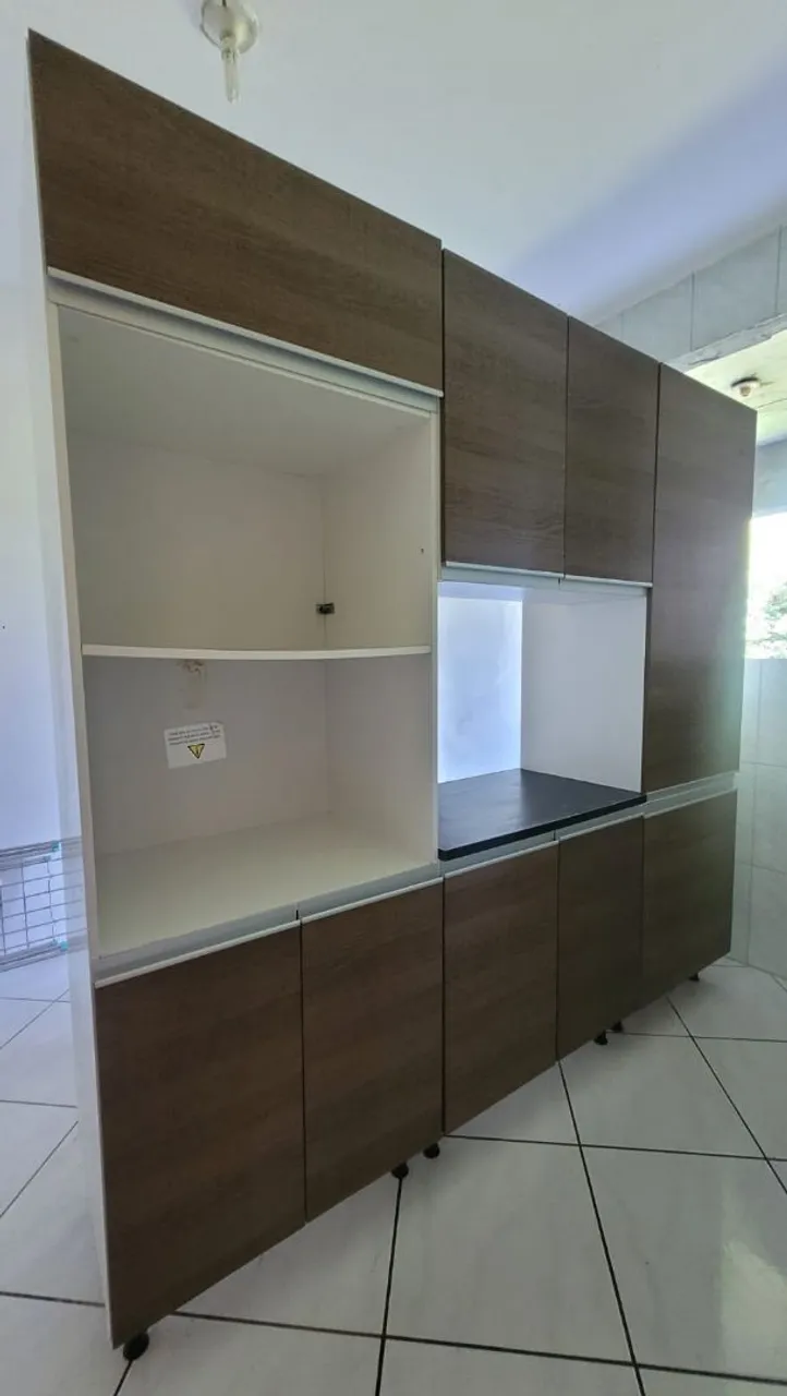 Armário de cozinha com paneleiro, prateleira de micro-ondas e forno elétrico e armário de mantimentos. Armário com bastante espaço para guardar louças, panelas e alimentos.