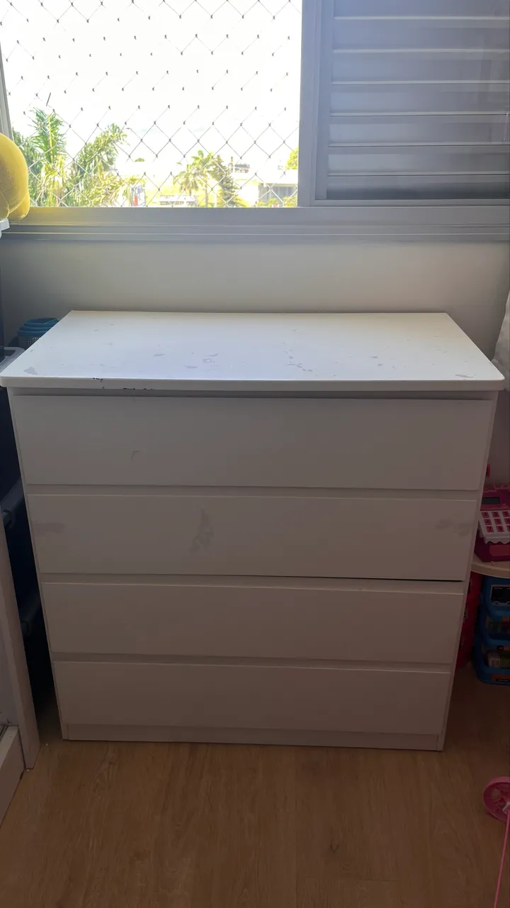 Essa cômoda fazia parte do jogo de quarto do meu filho. A madeira é laqueada branca porém com o uso foi descascando.