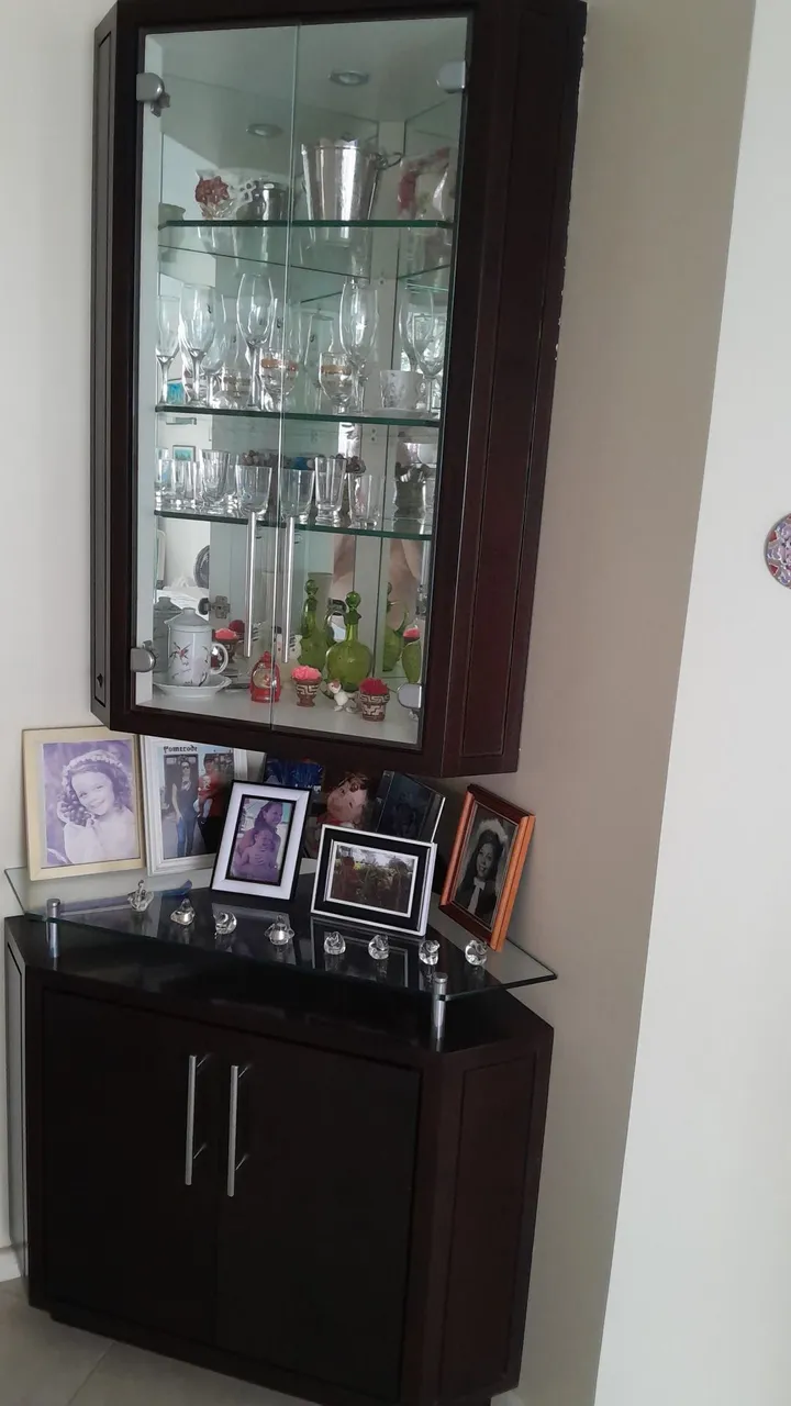 Linda cristaleira de canto, perfeita para valorizar sua sala de estar! Com design triangular e armário inferior, oferece praticidade e elegância. Ideal para exibir suas peças favoritas e organizar seus objetos de valor. Uma peça única para transformar seu ambiente!