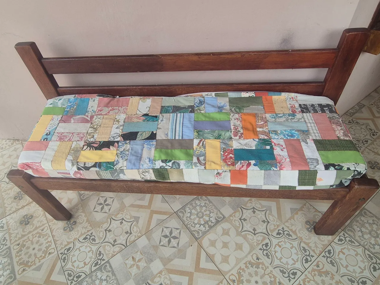 Banco de madeira com assento estofado, perfeito para dar um toque rústico e charmoso ao seu ambiente.