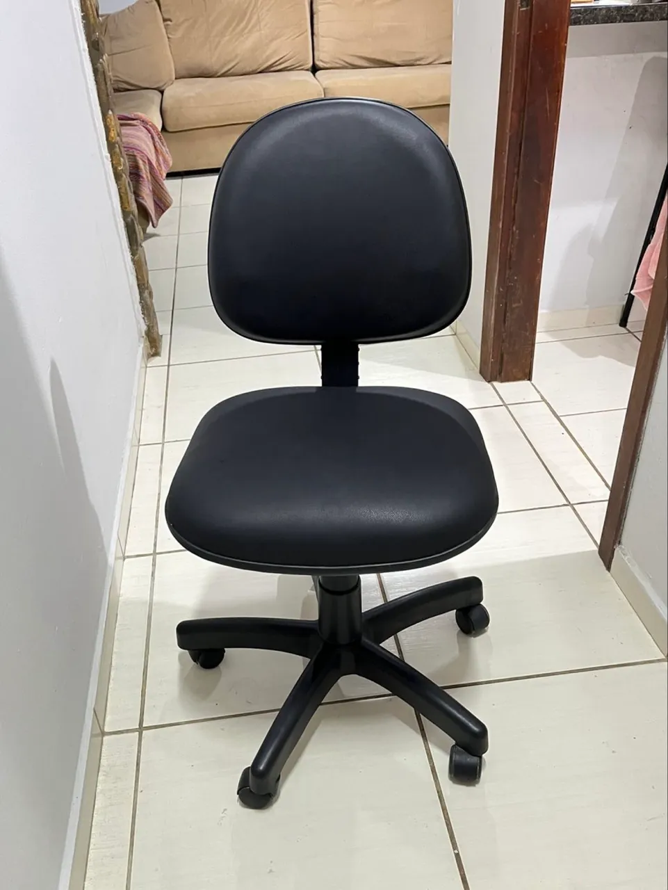 Cadeira de escritório preta, com estrutura firme e estofado novo.