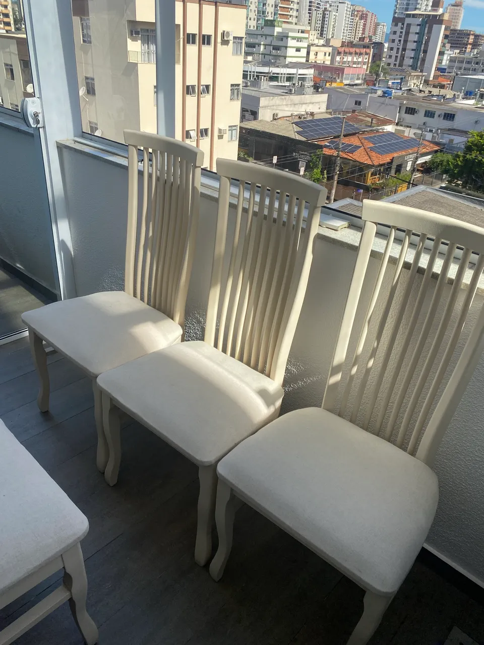 Conjunto de 8 cadeiras de madeira com estofado em linho. Foram reformadas (pintura e estofado) recentemente e estão em perfeito estado. Não estão bambas. Não é necessário comprar todas.