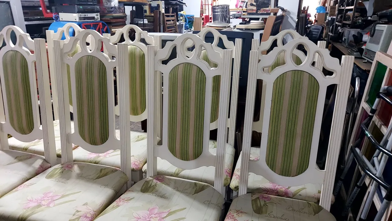 Conjunto de cadeiras de madeira antiga, com design clássico e elegante. Perfeitas para adicionar um toque de charme e sofisticação à sua sala de jantar. Oito cadeiras 1.600 parcelado 5 × ou avista 1.500 entregamos no local.