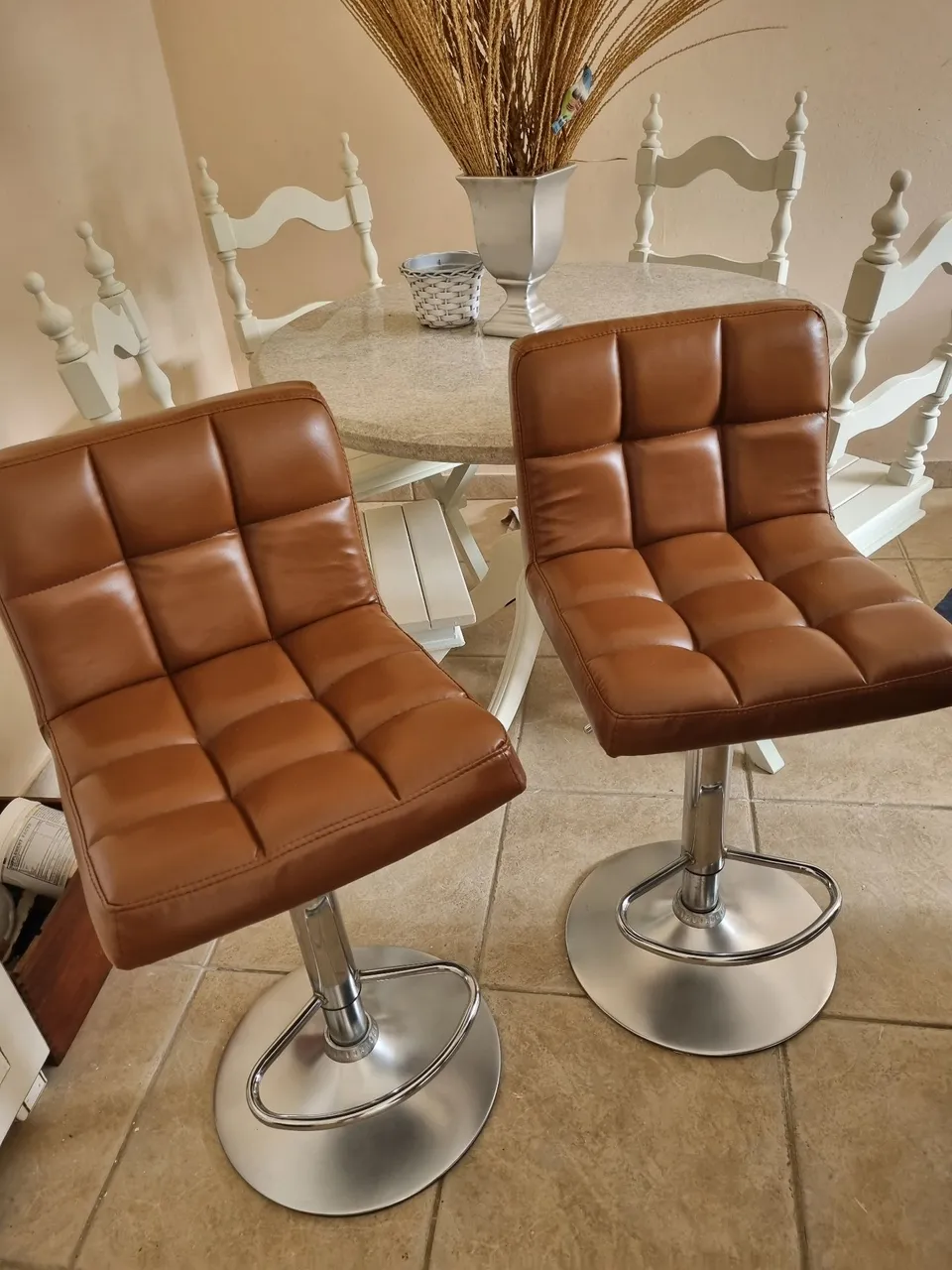 Adicione um toque de elegância e conforto à sua casa com este par de banquetas sofisticadas. Perfeitas para a sua cozinha, área gourmet ou bar, elas combinam design moderno e funcionalidade. Estofado novo. Regulagem de altura.