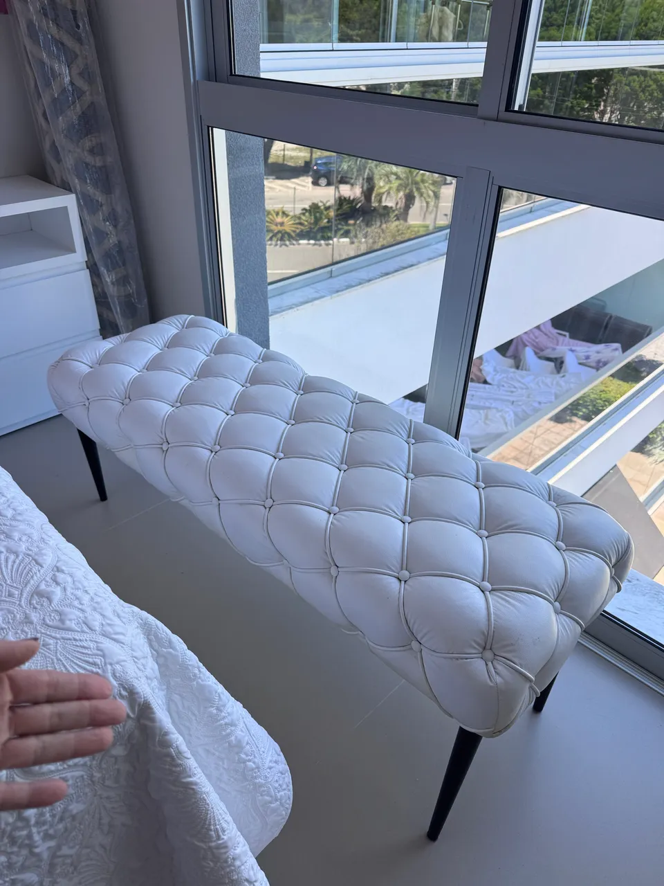Banco elegante em couro branco, perfeito para adicionar um toque de sofisticação ao seu ambiente. Design moderno e confortável, ideal para diversos espaços.