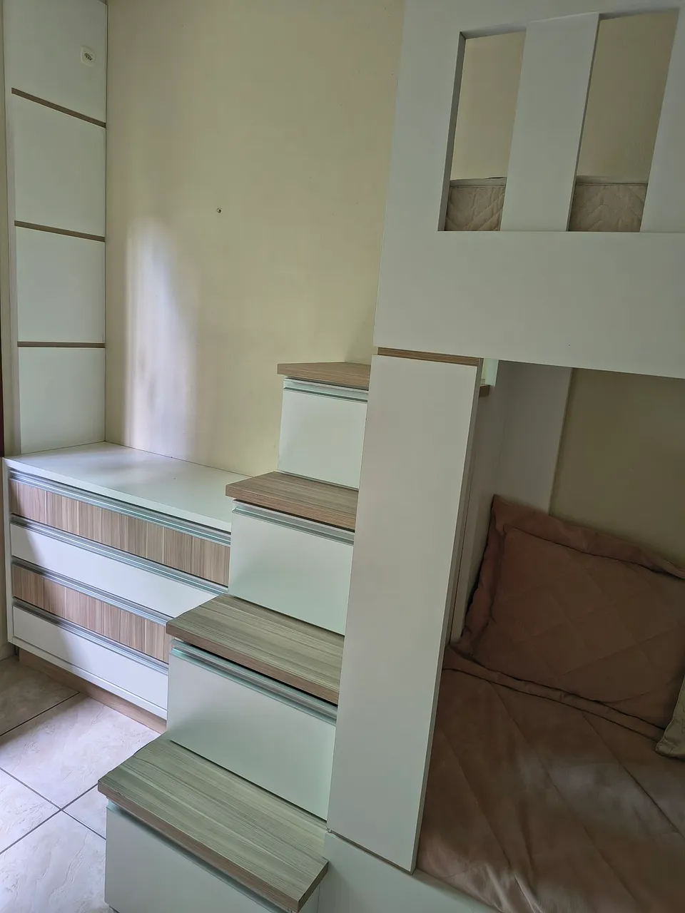Beliche funcional com escada que também serve como gaveteiro e cômoda integrada, otimizando o espaço do quarto, praticidade para um ambiente organizado.