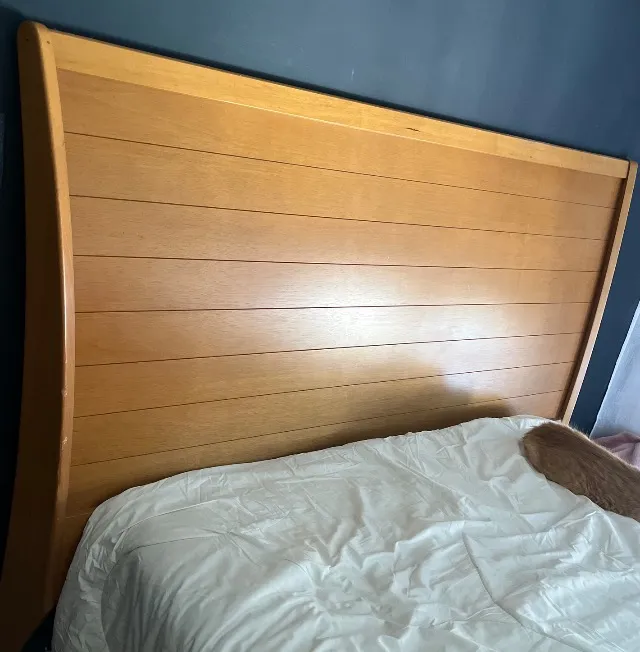 Cabeceira em madeira, não sei exatamente qual, mas é super pesada. Está sendo usada com colchão de casal, sobrando alguns cm de cada lado, mas possui tamanho queen.