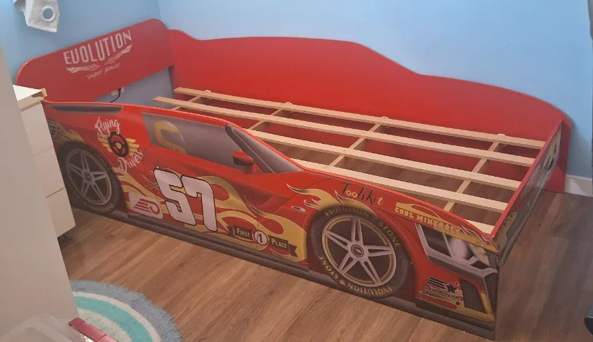 Cama infantil em formato de carro, em bom estado, apenas com pequenas marcas de uso. Feita em MDF resistente e durável, com suporte para até 90kg. Para tamanho de colchão solteiro (1,88 x 0,88).