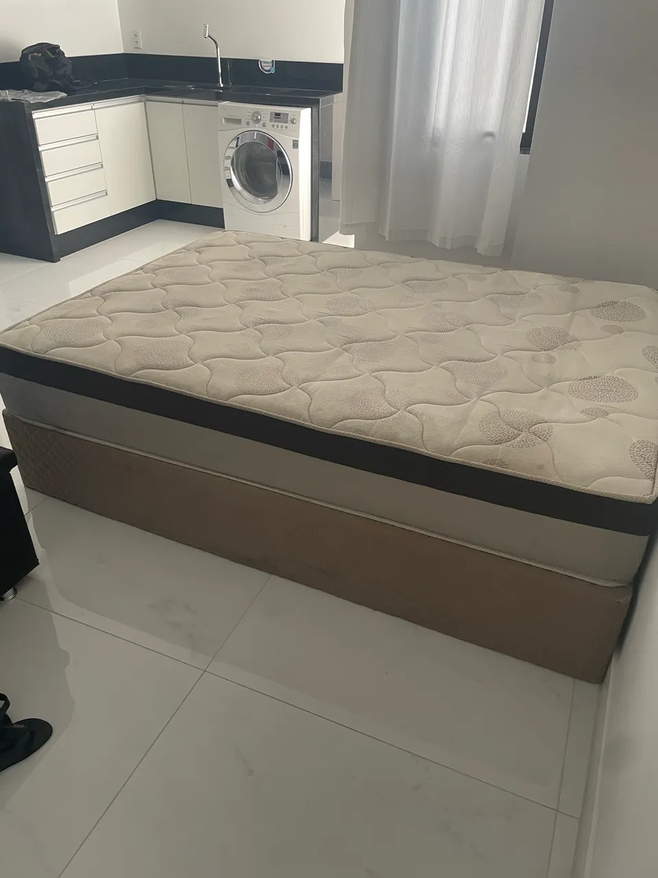 Cama de casal, tamanho normal ( tradicional) colchão + baú. Cor bege Tem pés . Só que não pus pra tirar fotos, retirar no centro . Valor R$ 600,00.