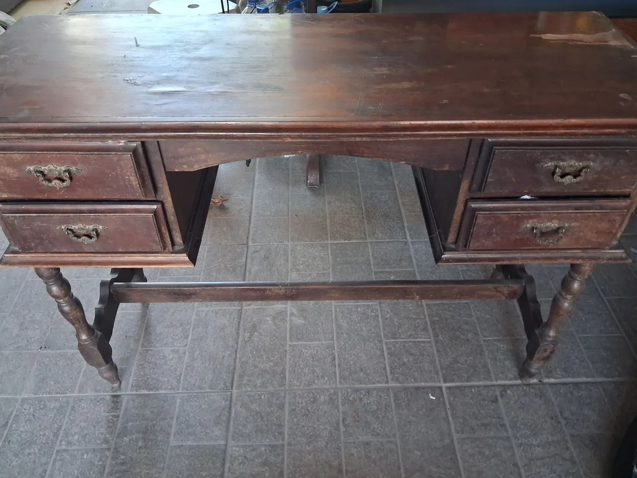 Linda mesa antiga de madeira maciça, perfeita para adicionar um toque clássico e elegante ao seu ambiente. Ideal para estudos ou trabalho, com amplo espaço e design atemporal.