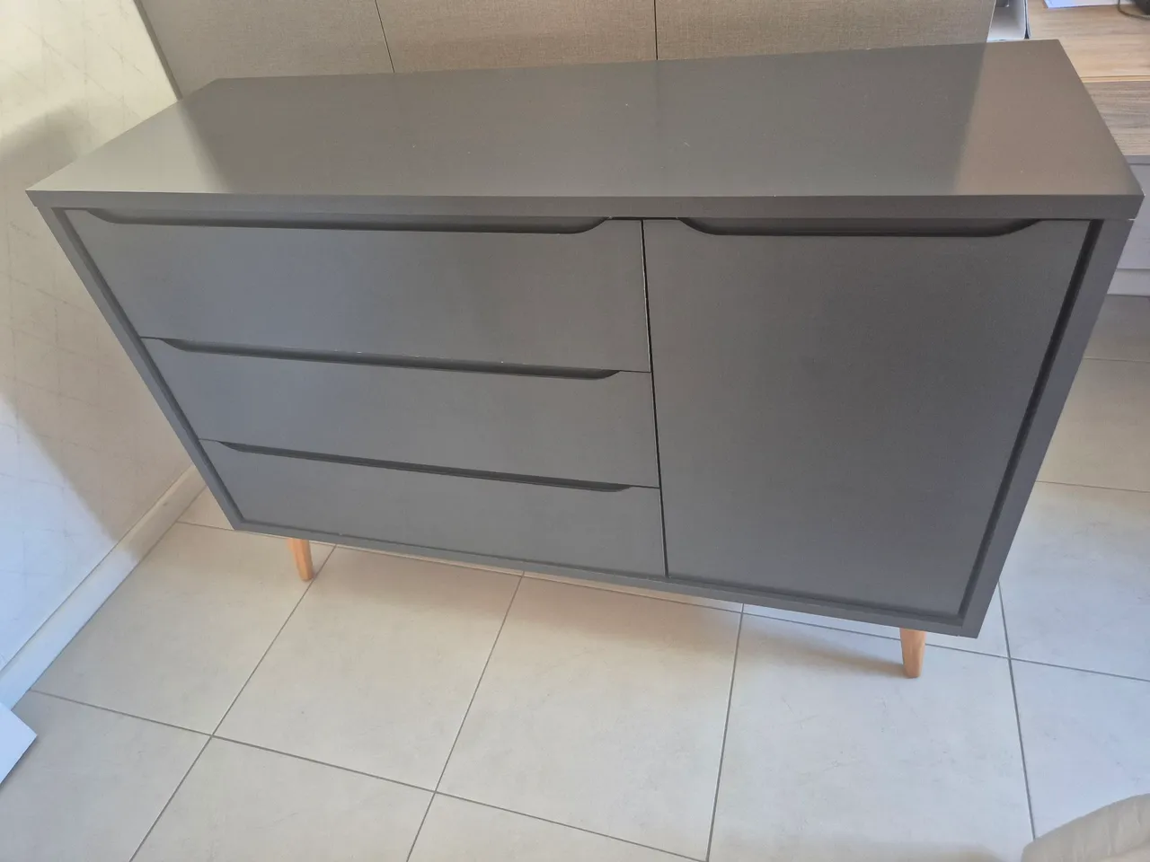 Comoda com com 3 gavetas e porta com uma prateleira, sendo a de cima com cabideiro interno.