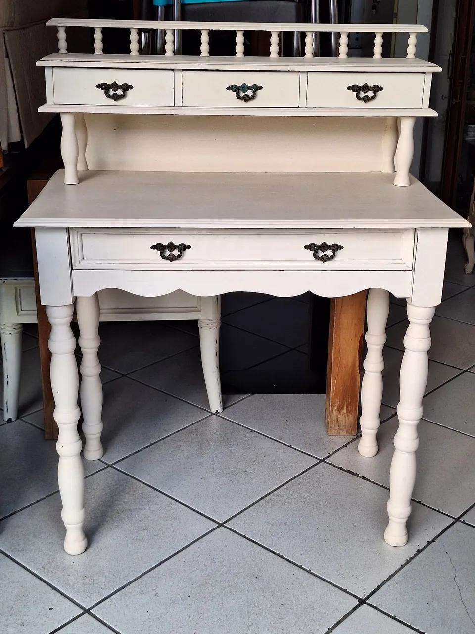 Linda escrivaninha de madeira maciça, perfeita para seu escritório ou quarto. Design elegante e funcional, com gavetas espaçosas para organizar seus pertences. Uma peça de mobiliário que combina beleza e praticidade, ideal para quem busca um ambiente de trabalho charmoso e confortável.