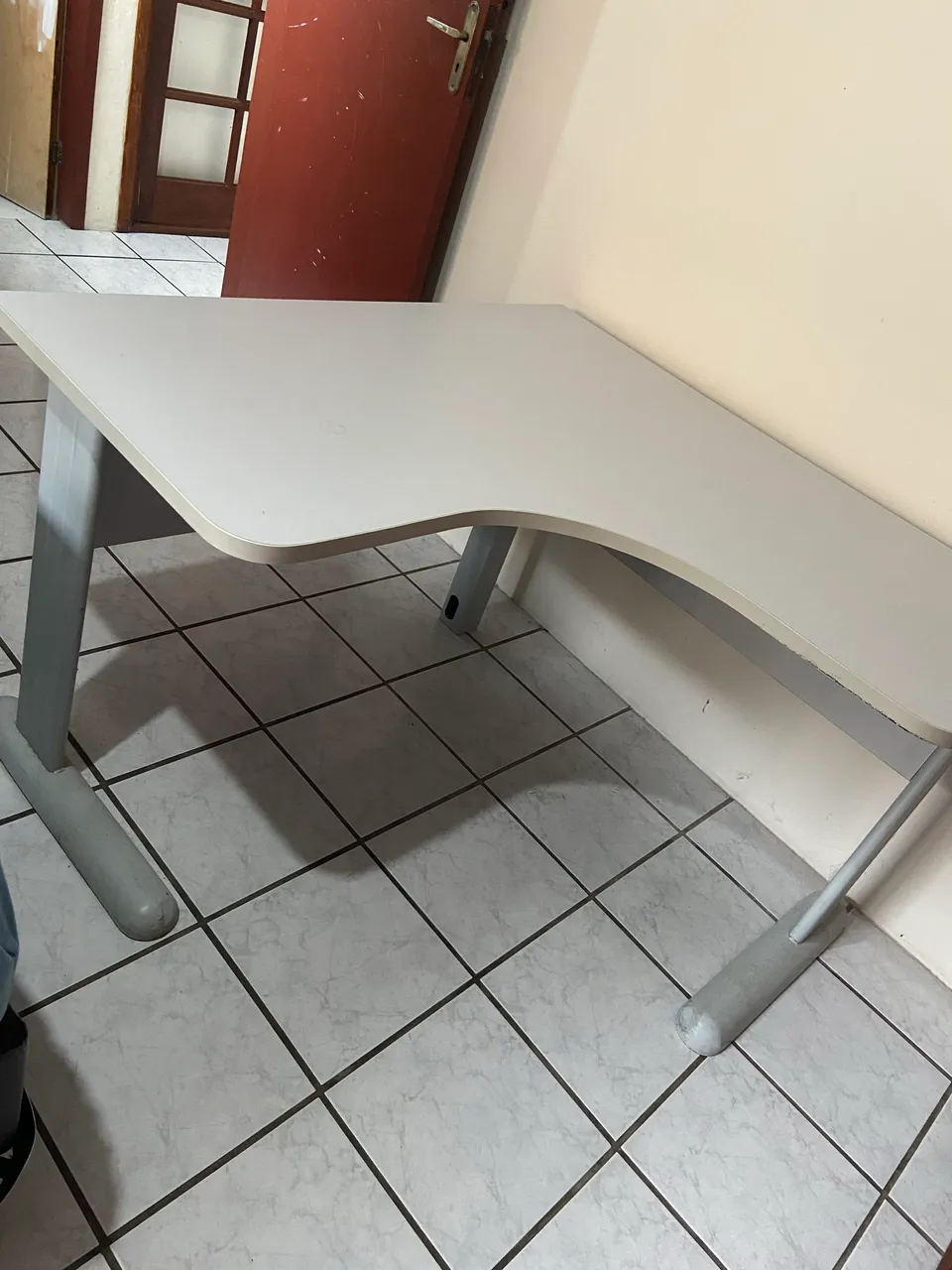 Escrivaninha de Canto em ótimo estado, ideal para quem precisa de espaço extra para trabalhar ou estudar. A mesa é cinza claro e feita de MDF e metal, com um design moderno e elegante.