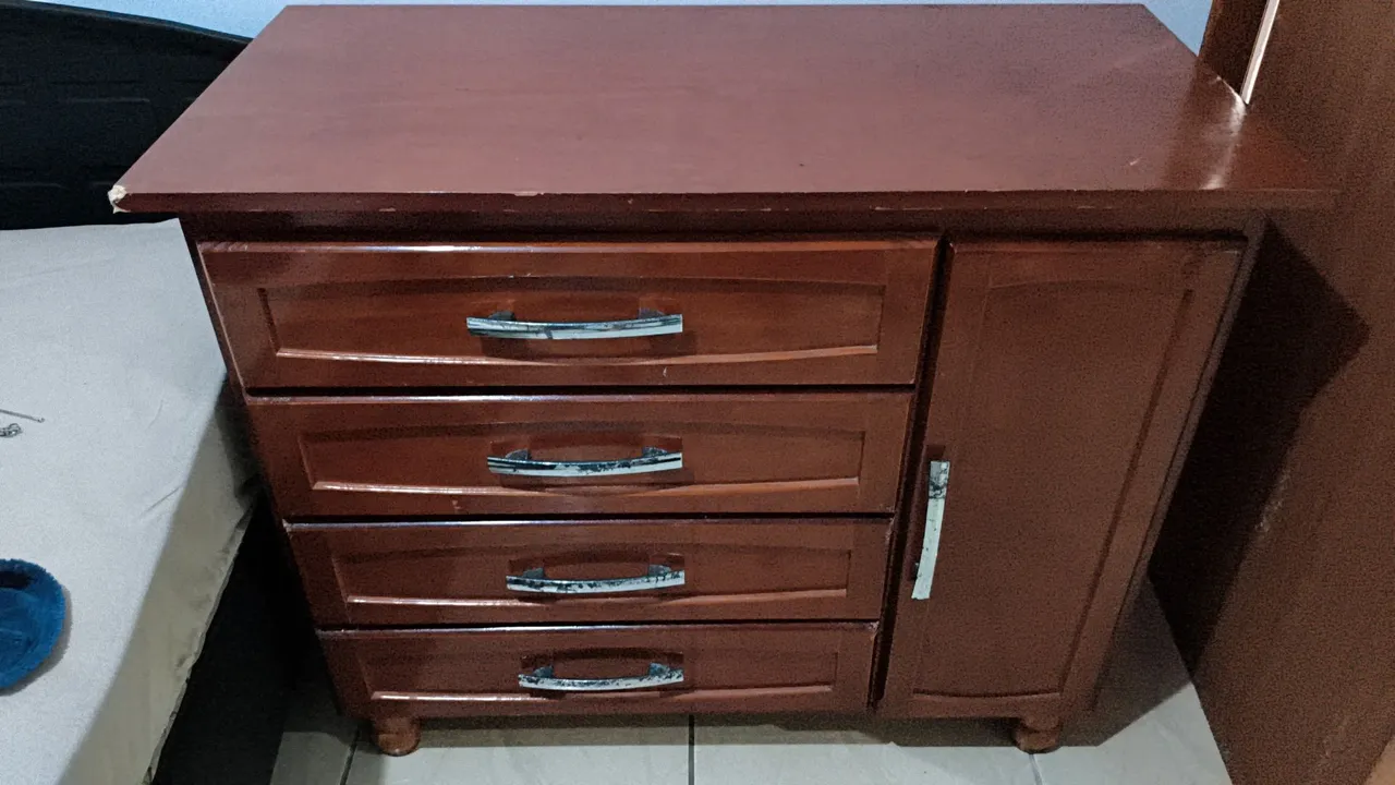 Penteadeira de madeira, em bom estado de conservação e bem firme, com gavetas e ótimo espaço de apoio.