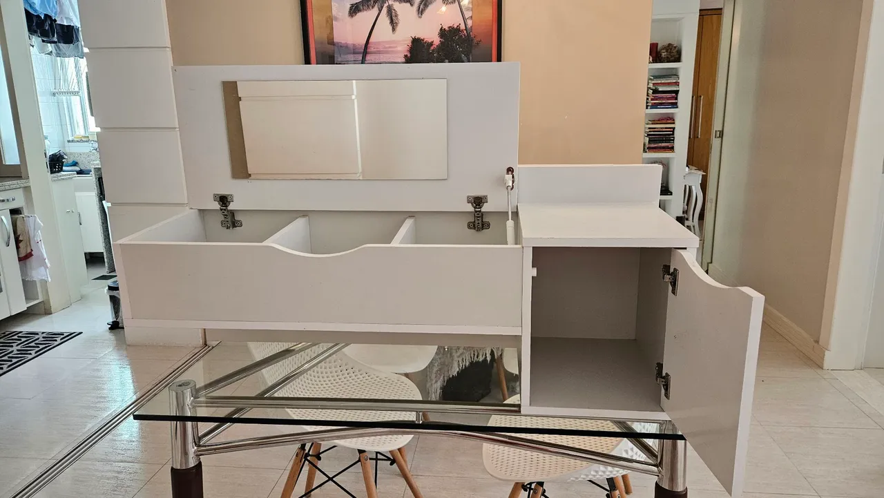 Linda penteadeira suspensa, perfeita para otimizar o espaço e adicionar um toque de elegância ao seu ambiente. Design moderno e funcional, com espelho e compartimentos para organizar seus itens de beleza. Ideal para quem busca praticidade e estilo.
