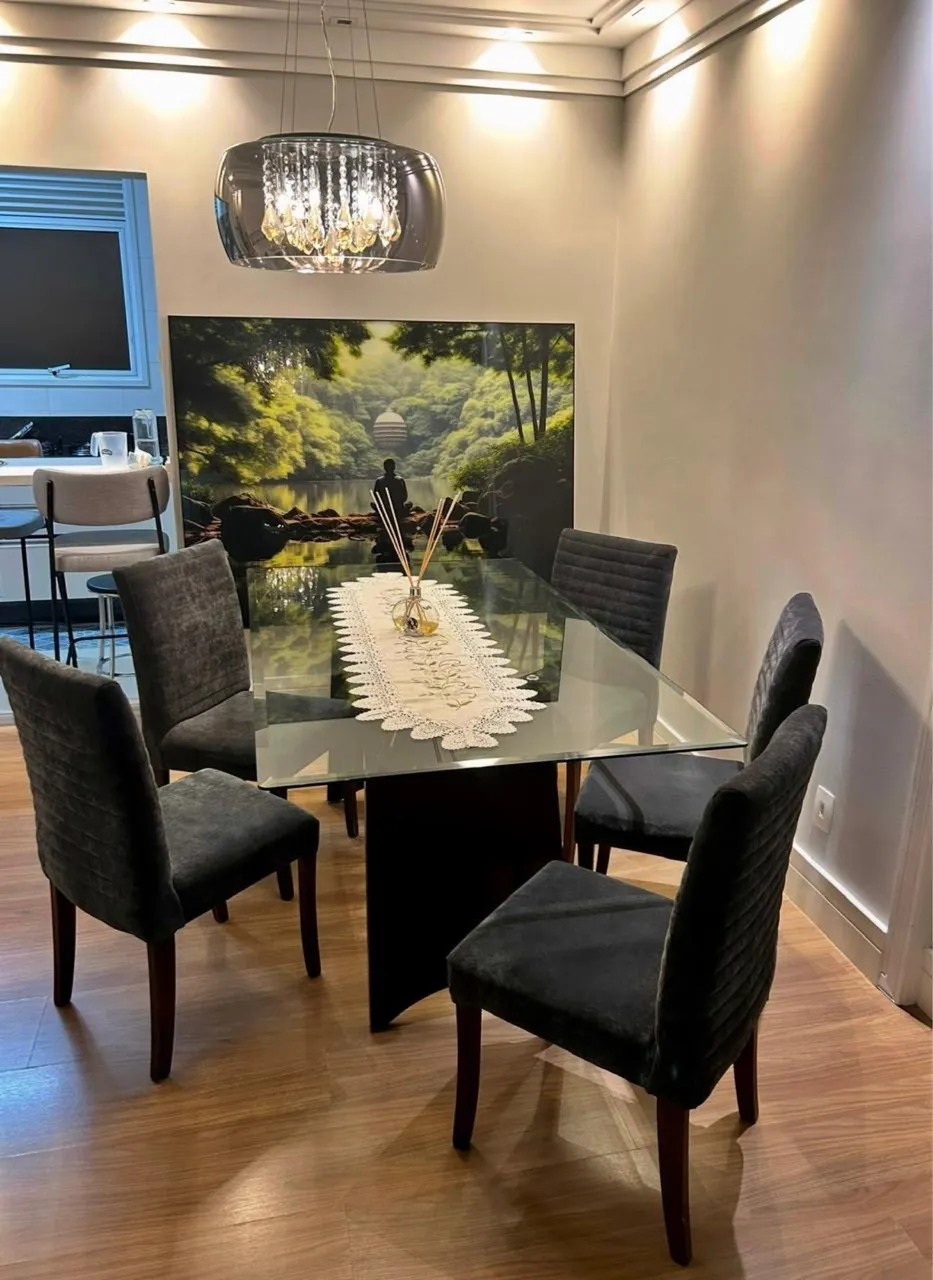Conjunto completo para sua sala de jantar! Mesa elegante com tampo de vidro, 6 cadeiras confortáveis e um lustre sofisticado. Perfeito para refeições e momentos especiais.