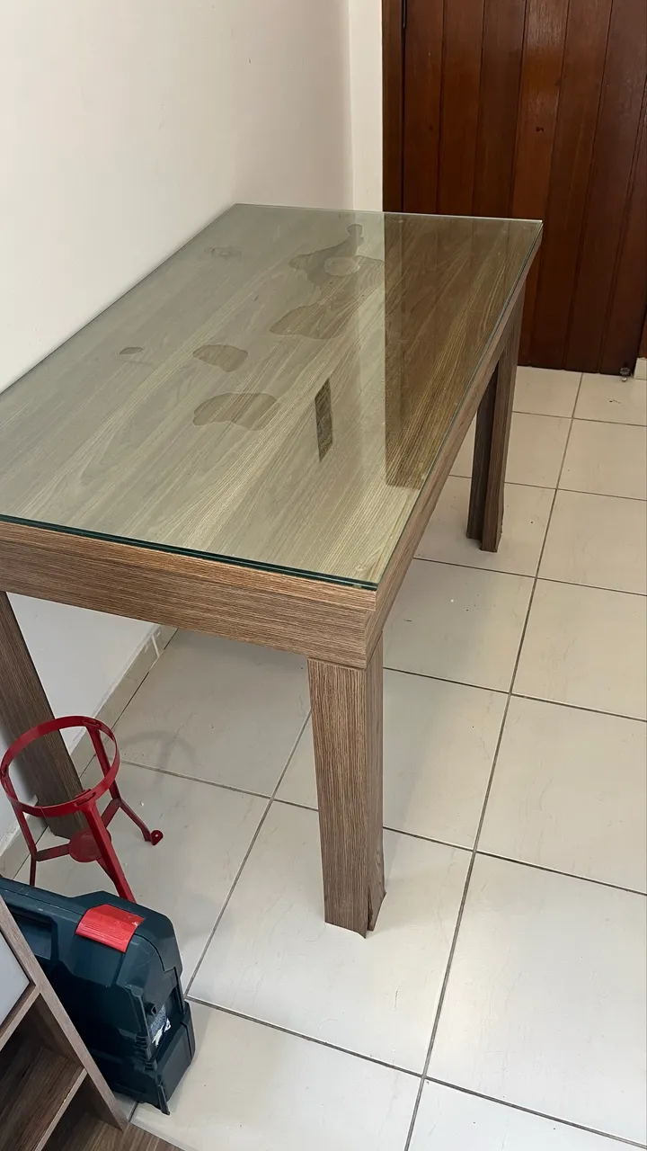 Mesa com tampo de vidro está com um dos pé meio solto e um pouco inchado de água
