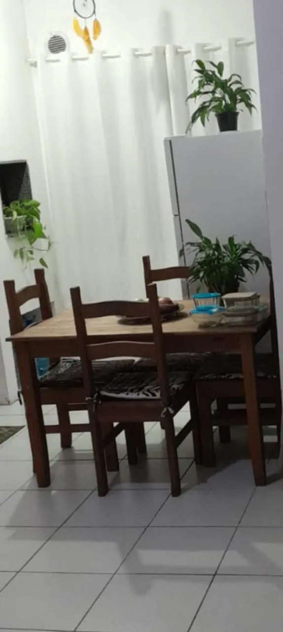 Mesa de madeira com 4 cadeiras. Perfeita para refeições, design clássico e resistente, ideal para qualquer ambiente.