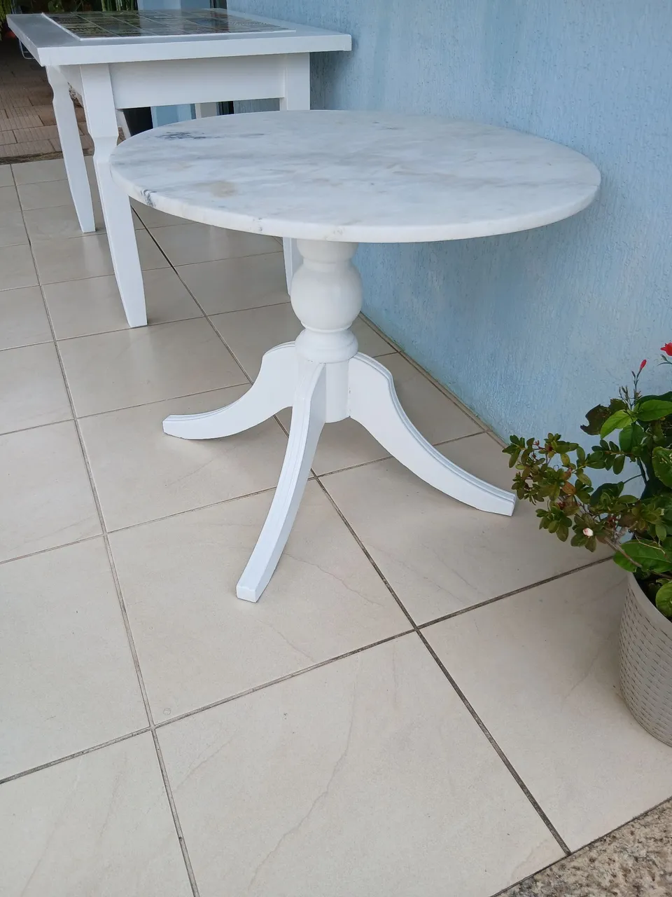 Linda mesa antiga com tampo em mármore e base branca, e pé madeira perfeita para dar um toque de requinte ao seu ambiente. Design clássico e elegante, ideal para diversos espaços. 80 diâmetro e 67 alt.
