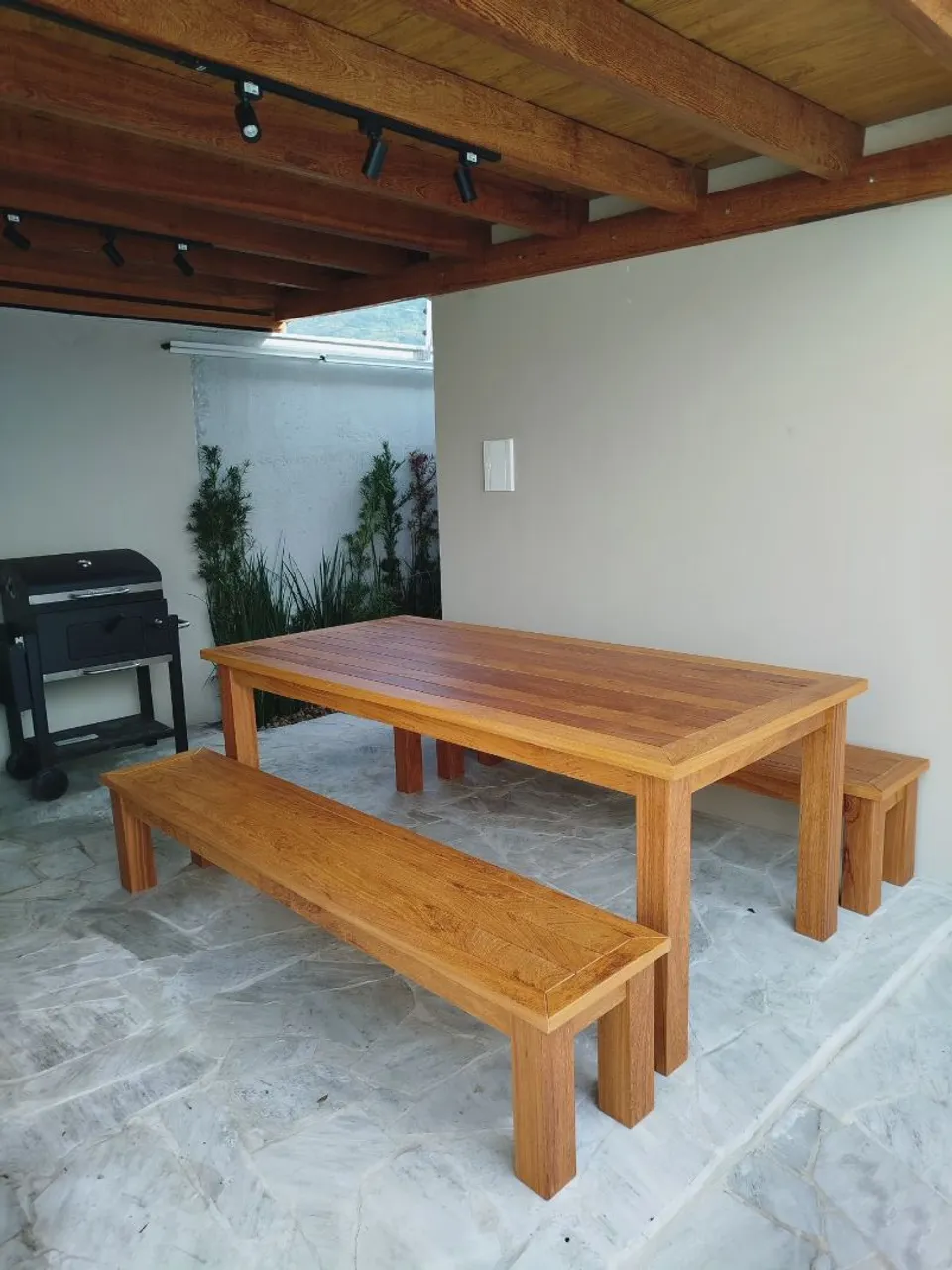 Mesa para área externa fabricada por encomenda em madeira de angelim com tampo maciço de 30mm de espessura. Acabamento em verniz. Medidas de 210x100 e 78 de altura. Bancos vendidos separadamente. Mais no insta @al.ma.rustica ou no whatsapp 489... ver número