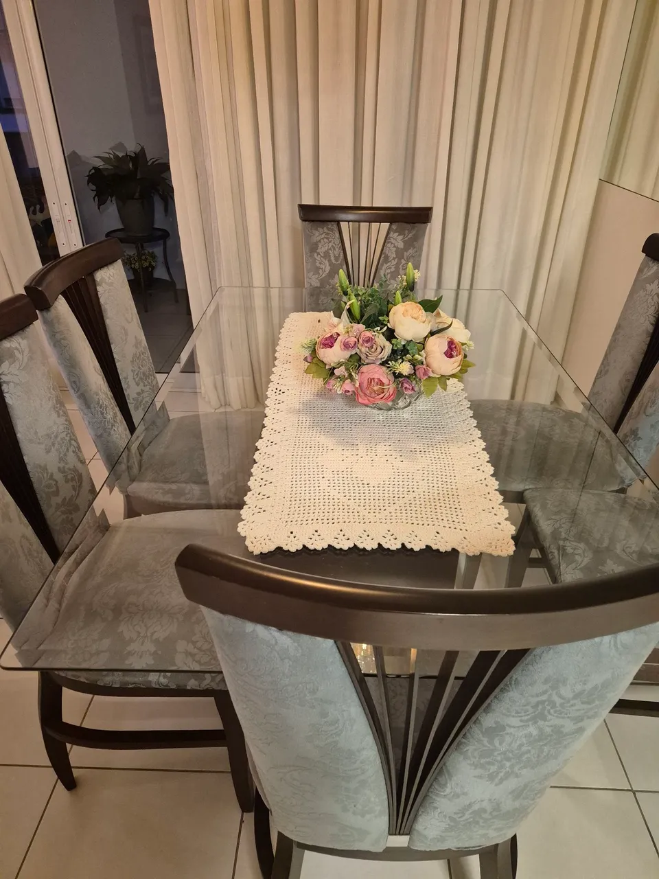 Mesa de jantar com tampo de vidro com 6 cadeiras, em ótimo estado