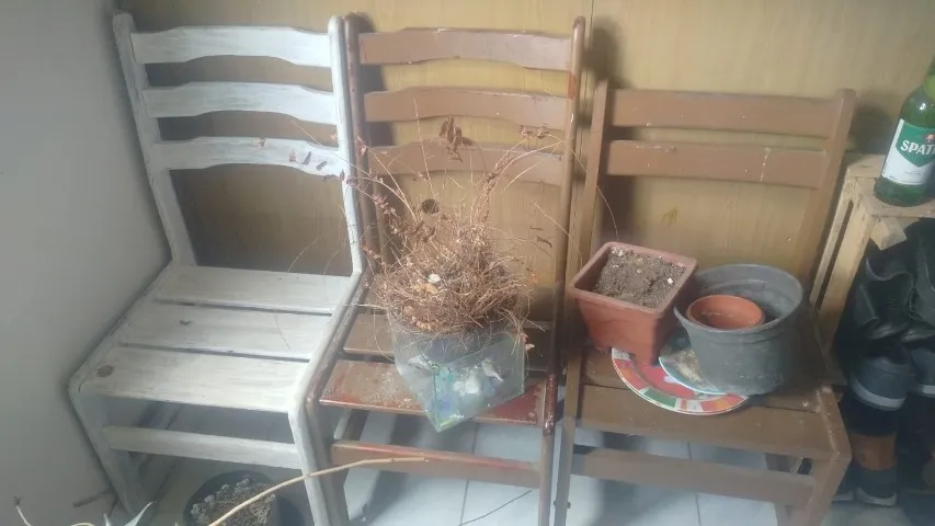 Mesa de jantar de madeira com tampo de compensado com 4 cadeiras de madeira, necessita restauração
