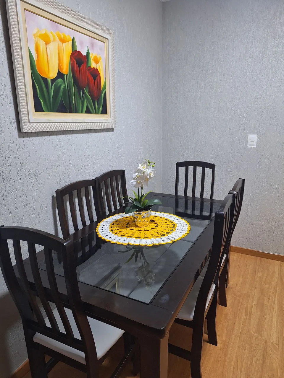 Linda mesa de madeira com tampo de vidro e 6 cadeiras para sua sala de jantar. Design elegante e moderno, ideal para reunir a família e amigos em momentos especiais. Peça já a sua!