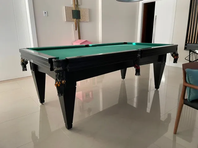 Mesa de sinuca 7Ball, dimensões externas 236 x 132 x 86 cm (CxLxA), estrutura em madeira maciça, caçapas em couro substituídas recentemente, tampo em pedra ardósia, revestido com tecido de lã na cor verde substituído recentemente, totalmente desmontável, podendo ser entregue montada ou desmontado. Em estado excelente. Acompanha taqueria, conjunto de 6 tacos, e conjunto de bolas.
