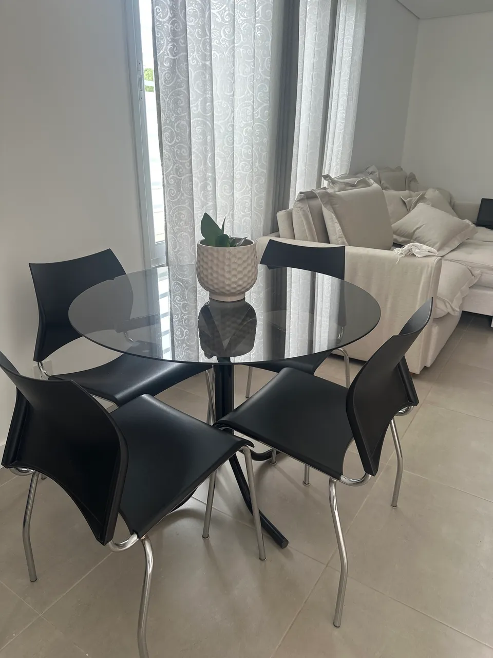 Mesa de vidro redonda, 98 centímetros. Cadeiras em Polipropileno com pés em tubo de aço cromado. Retirar no local