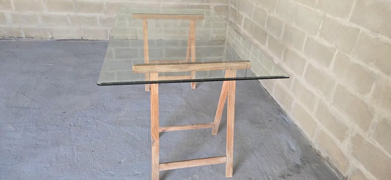 Linda mesa com tampo de vidro e cavaletes, ideal para diversos ambientes. Design moderno e elegante, perfeita para sua casa ou escritório. Dúvidas