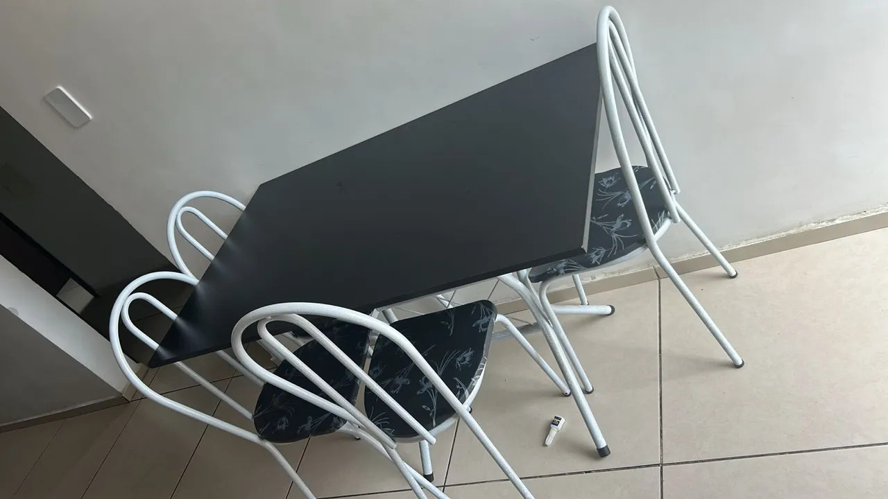 Mesa pequena com 4 cadeiras, uma delas precisa de reparo, as demais estão Ok.